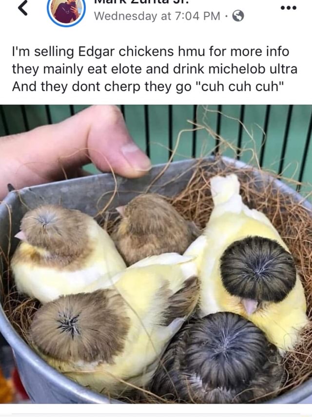 I M Selling Edgar Chickens Hmu For More Info They Mainly Eat Elote And Drink Michelob Ultra And They Dont Cherp They Go Cuh Cuh Cuh